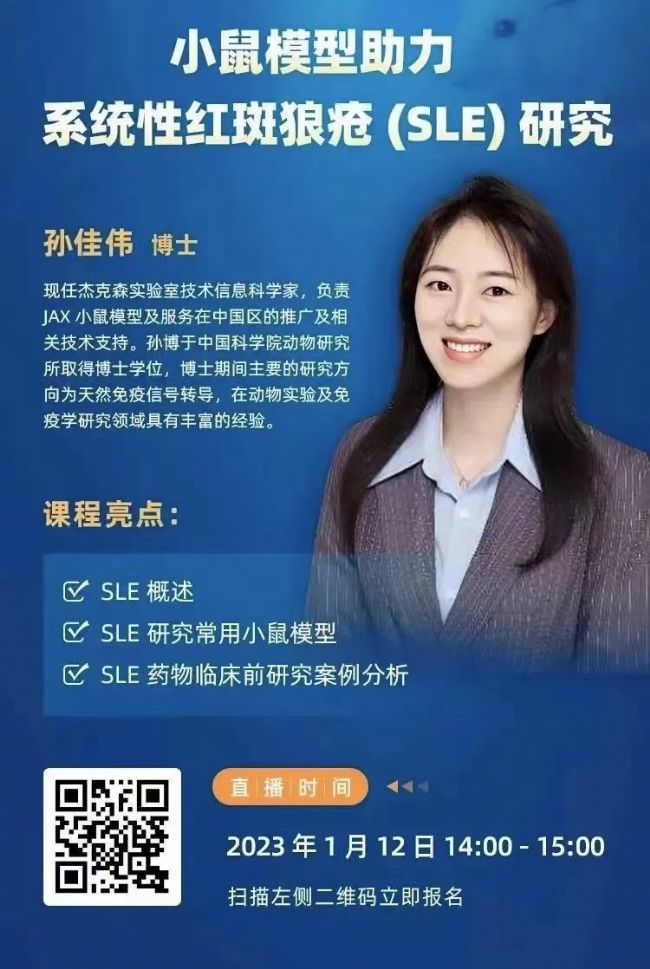 1月12日,下午14:00~15:00,杰克森实验室技术信息科学家孙佳伟博士将为大家带来【小鼠模型助力系统性红斑狼疮 (SLE) 研究】的线上直播讲座。